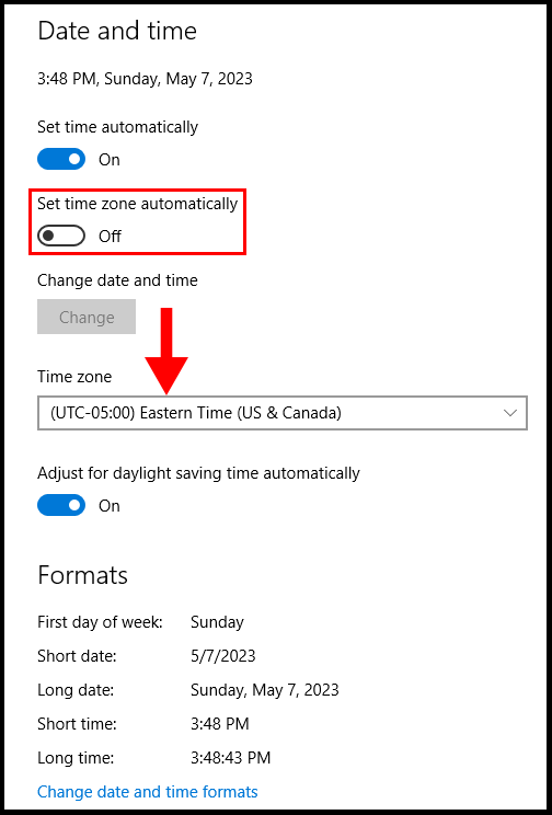 • Go to “Change time zone”, drop down the list of time zones, and select your preferred time zone.